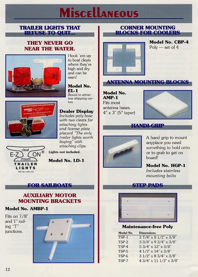 E-Z On Cleat Mount Lites Dealer Display Base (Free w/4 or more EL-1's) Auxiliary Motor Mounting Bracket Corner Mounting Blocks (4) for Cooler Antenna Mounting Block Handi-Grip Poly Step - 8 1/8" x 2 7/8" Poly Step - 9 3/4" x 3 3/8" Poly Step - 12" x 5 3/4" Poly Step - 14" x 4 1/2" Poly Step - 8 3/4" x 3 1/2" Poly Step - 11 1/2" x 4 3/4" |